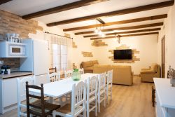 El gran salón con cocina hará el centro de reunión perfecto, alrededor de la gran mesa de comedor, podéis pasar ratos en familia o con amigos disfrutando de nuestros juegos de mesa o charlando. Pero además, la gran cocinilla/merendero también es un espacio estupendo para pasar el rato frente al horno de leña.
