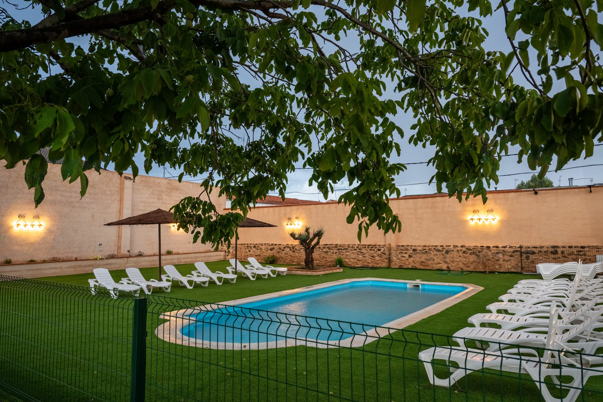 • Piscina privada con amplia zona de cesped, tumbonas, sombrillas y vallado de seguridad